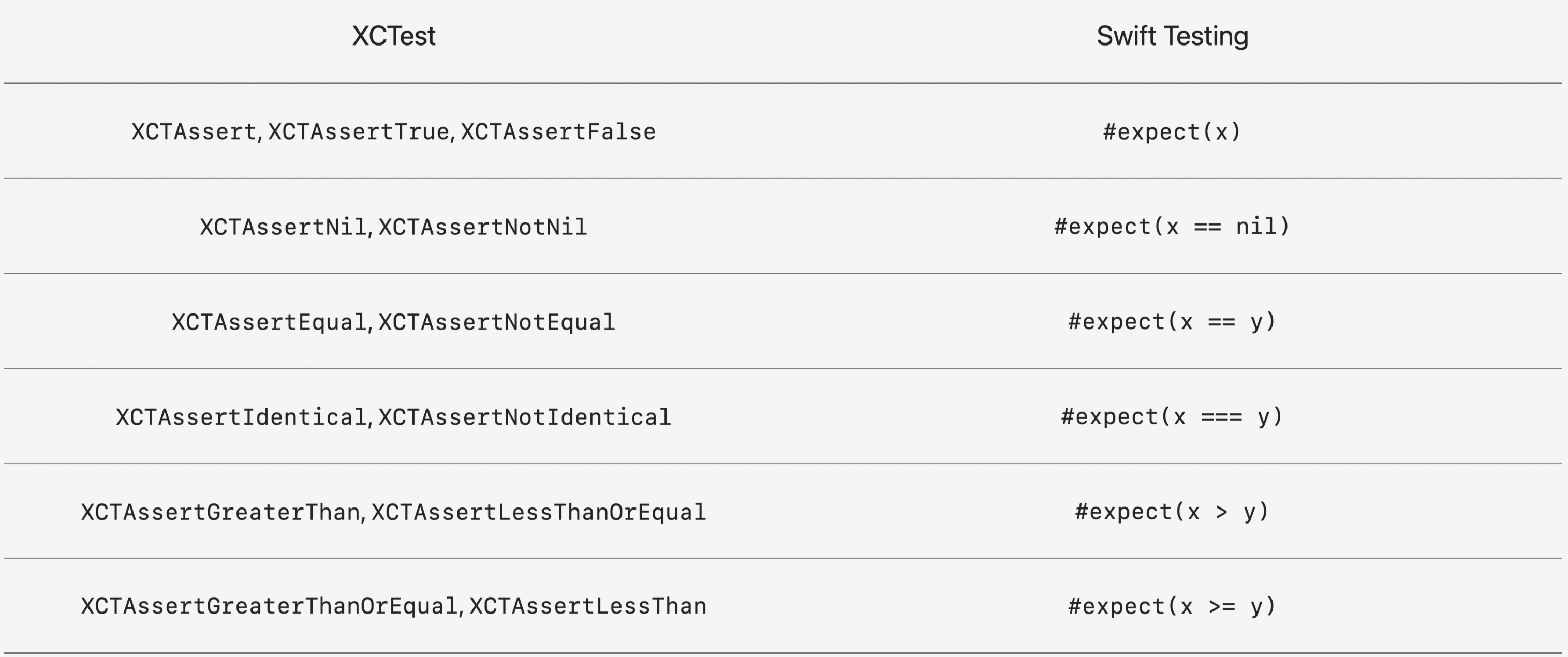 - Avoid calling XCTAssert (...) from Swift Testing tests, or \#expect (...) from XCTests -> 교차 사용 금지