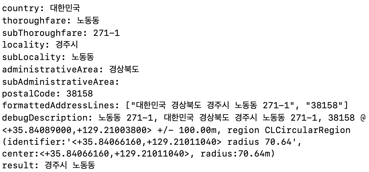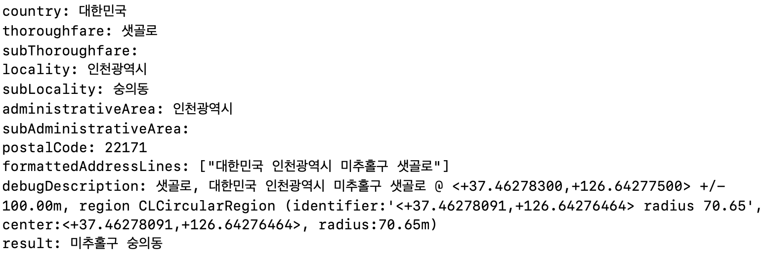 이후에 동네를 산책하면서 테스트해보니 다음과 같은 경우가 있었다. 위의 두 가지 방법으로 전체 주소를 얻으면 도로명 주소가 나오게 되면서 동에 대한 정보는 얻을 수 없었다. 다만 subLocality에는 동이 제대로 찍힌다.