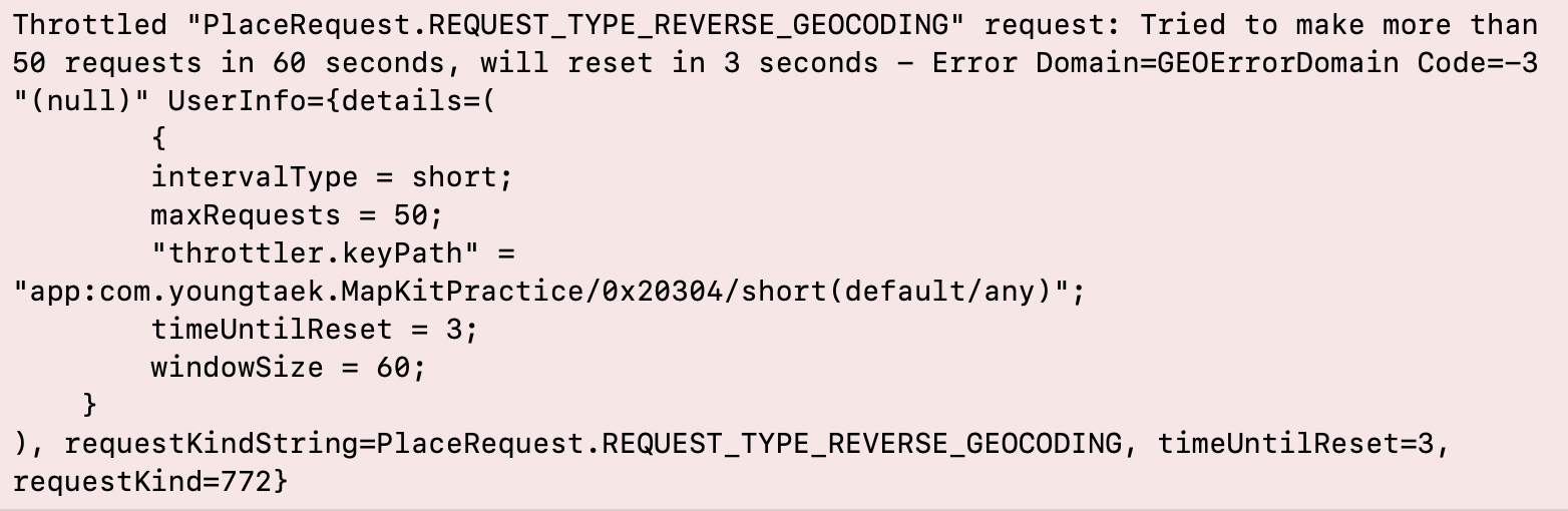 주의사항은 이 작업이 인터넷 연결을 필요로 한다는 점이다. 네트워크를 끊으면 오류가 발생하는 것을 볼 수 있다. (The operation couldn’t be completed. (kCLErrorDomain error 2.) 또한 너무 빈번하게 요청하는 경우에도 같은 오류가 발생하며, 여기에 더해 쓰로틀링되었다는 로그가 출력된다.