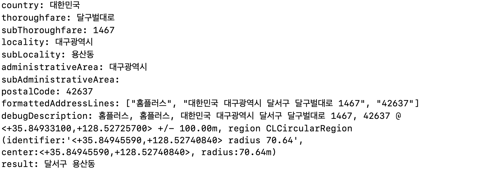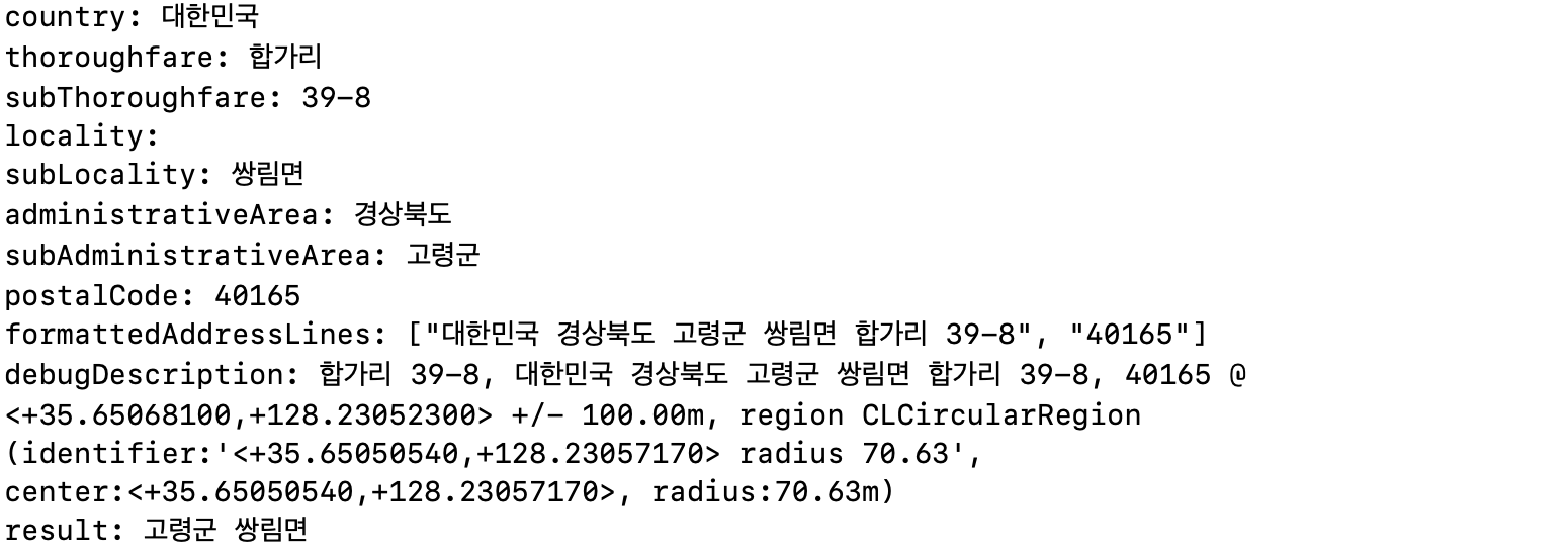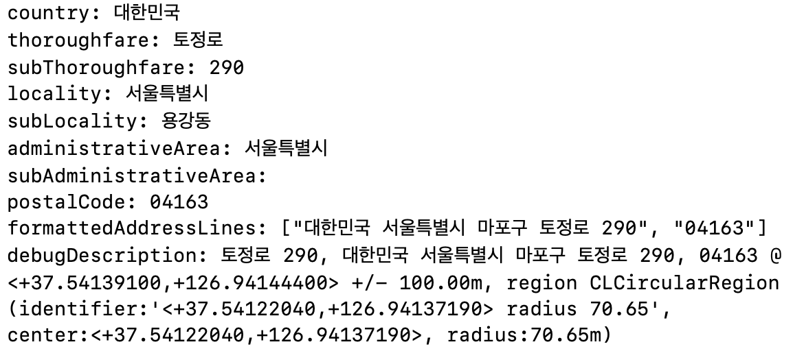 CLPlacemark는 NSObject의 debugDescription()을 오버라이딩하고 있어서 프로퍼티로 얻을 수 있는 정보 외에 다양한 정보를 문자열로 가져올 수 있다.